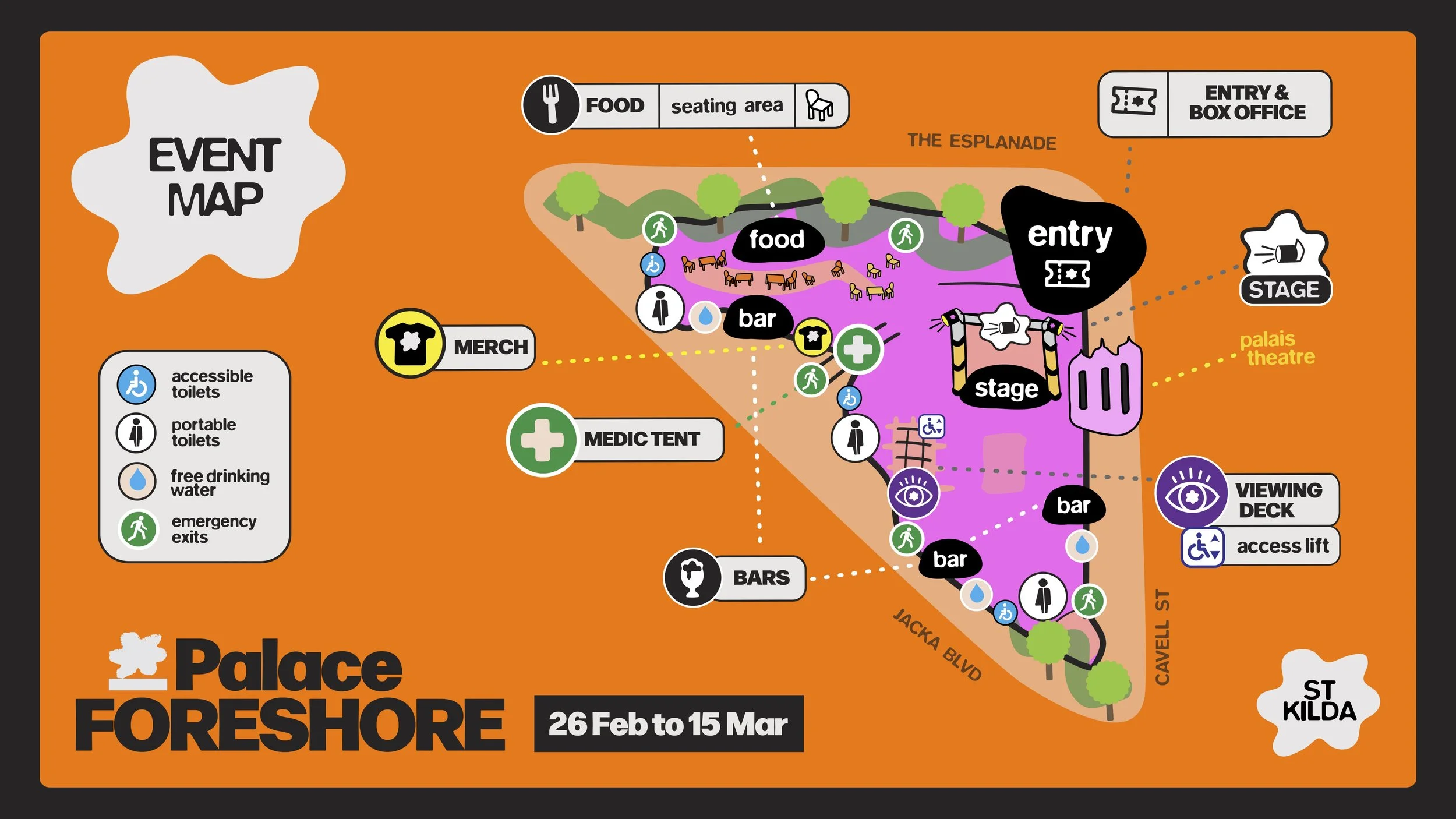 More than just a concert stage, the precinct is a complete festival experience. Guests can enjoy a curated selection of Melbourne’s best food trucks, pop-up bars serving ice-cold drinks, and relaxed social areas to soak up the sea breeze before the show.